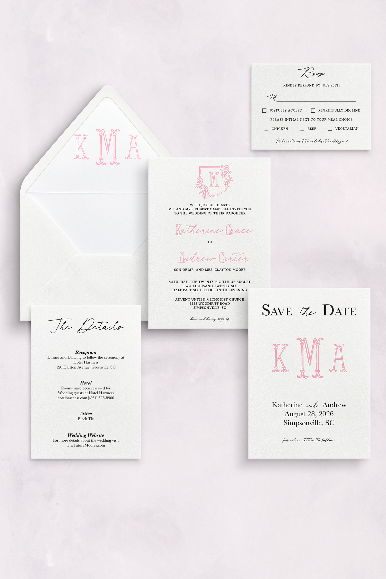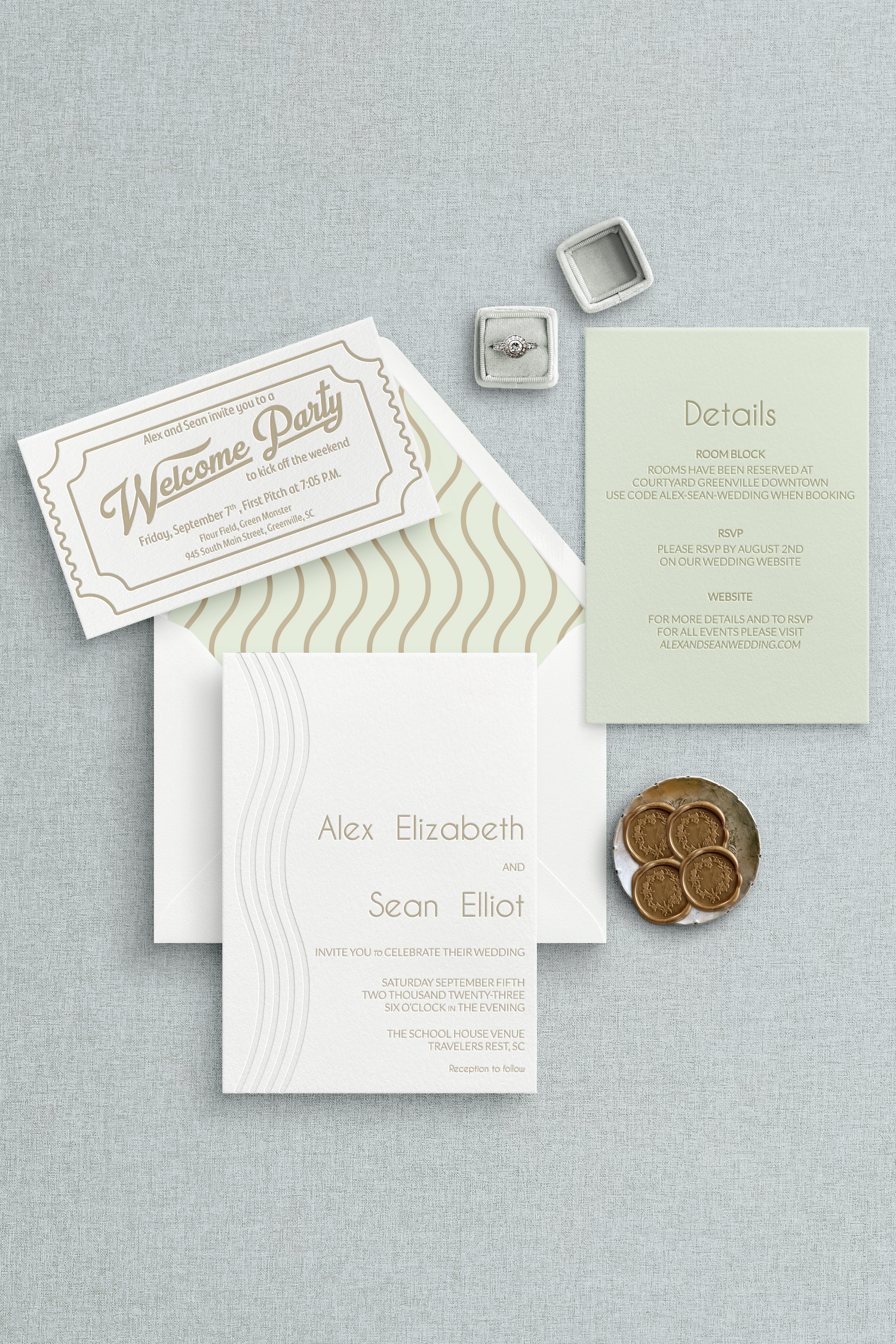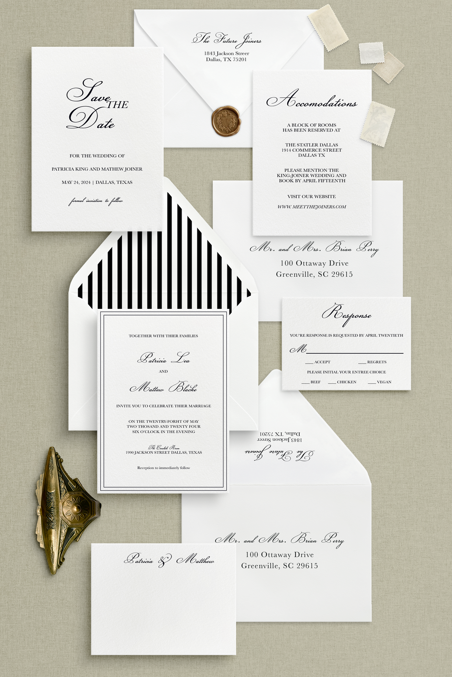 Our Bespoke Suites are designed specifically for you and your spouse. If you have been dreaming of letterpress invitations for years, this is for you! We want to bring your vision to life with colored paper, personalized design elements, die cuts, and embellishments.