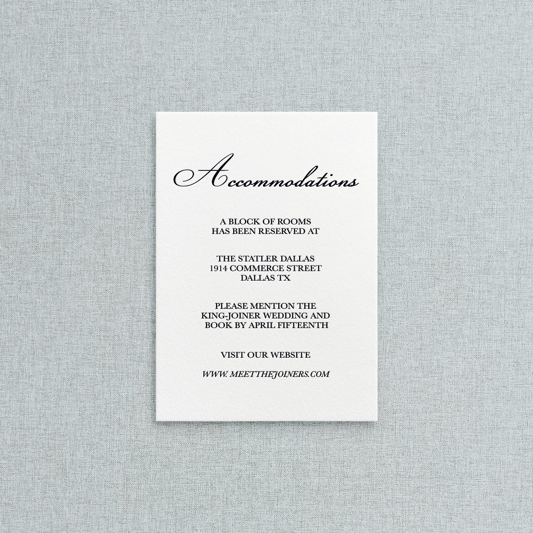 Pair the details card with your invitation to include any other details guests might need for the weekend. This could be your wedding website for responses and your registry, information about a room block and shuttles, or a welcome party and parting brunch. We can customize the text to include any information you would like. The layout will remain the same, but the information can be changed out.