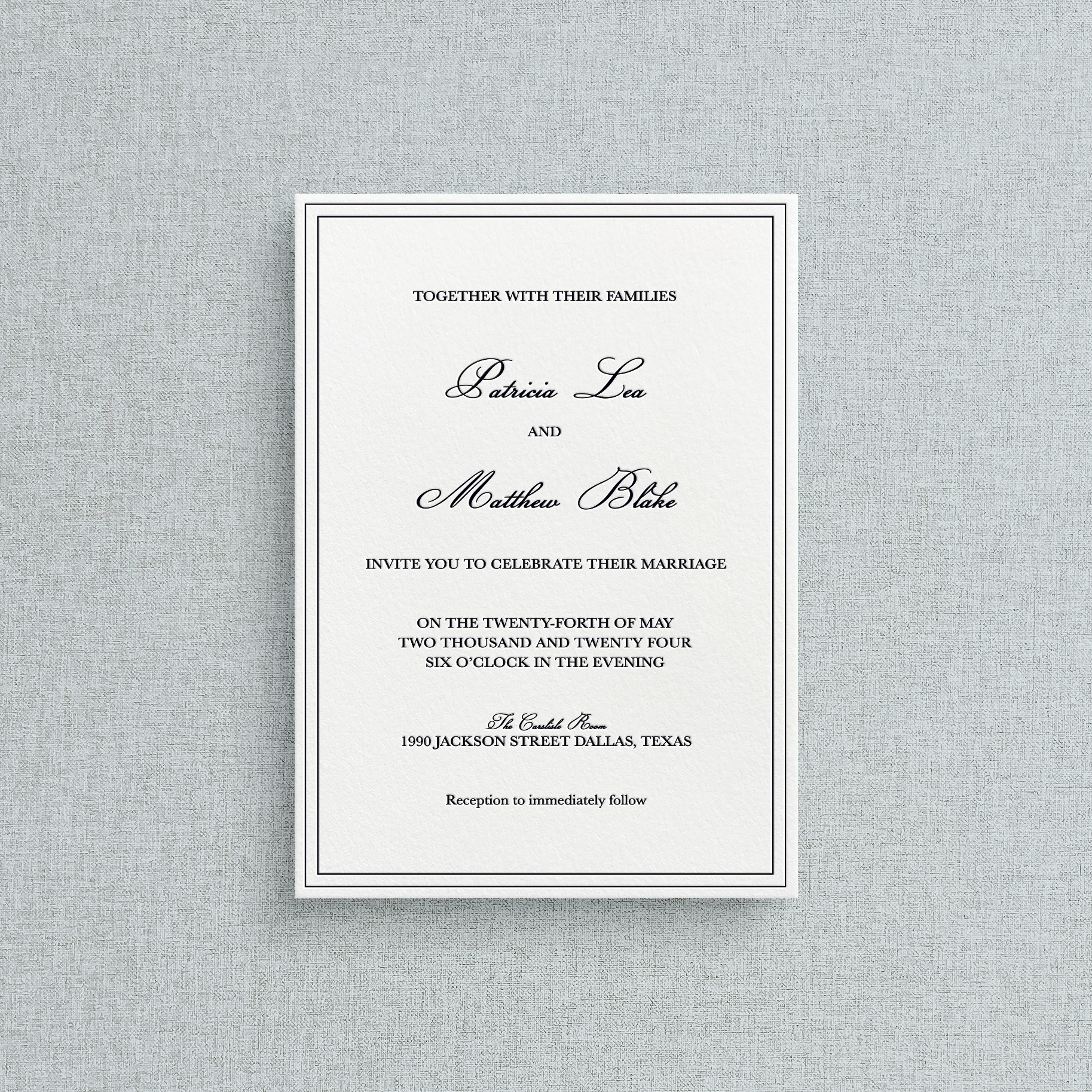 The Patricia Curated Collection features a bold double border with your and your spouse's names in a timeless serif font, a beautiful way to invite guests to help you celebrate your big day.